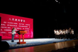 活动中,学院书记彭宇为周燕龙老师颁发“从教三十年” 荣誉证书,随后与周燕龙共同带领14位新入职教师庄严宣誓,铿锵誓言彰显新教师投身教育的决心。