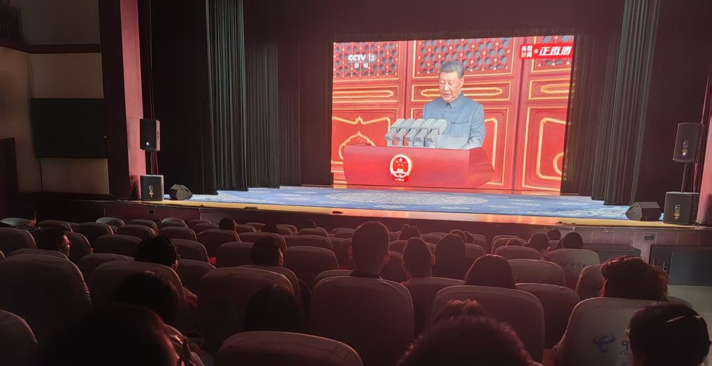 剧场内,全体教师凝神屏息,共同注视着大屏幕上阅兵盛况。整齐的方阵、先进的装备、翱翔的战机,引来阵阵掌声,民族自豪感在每个人心中激荡。观看过程中,会场秩序井然,教师们全神贯注。当国旗护卫队迈着铿锵有力的步伐出场,各受阅方阵依次通过天安门广场时,教师们不时发出赞叹;当新型武器装备震撼亮相时,剧场内响起热烈掌声。大家一起惊叹、一起鼓掌,这种集体共鸣是单独观看无法比拟的。教师们兴奋地交流讨论,“80年前中国人民以巨大牺牲换取抗战胜利,这段历史必须永远铭记。作为艺术院校教师,更要肩负起传承红色文化、弘扬爱国主义精神的神圣使命。”