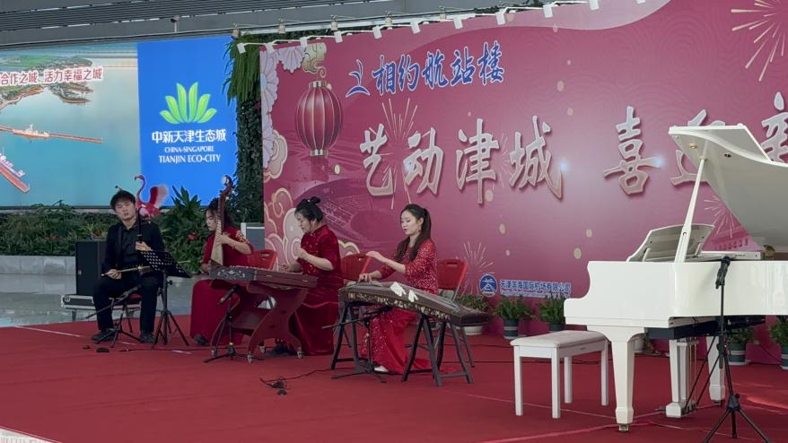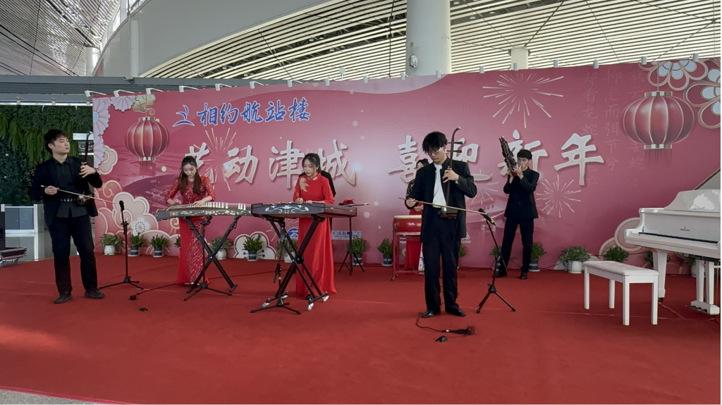 《云宫迅音》《喜洋洋》《金蛇狂舞》等喜庆的经典民乐合奏更是频频将演出推向高潮,让现场观众瞬间沉浸在浓厚的节日氛围中,引得旅客们阵阵喝彩。